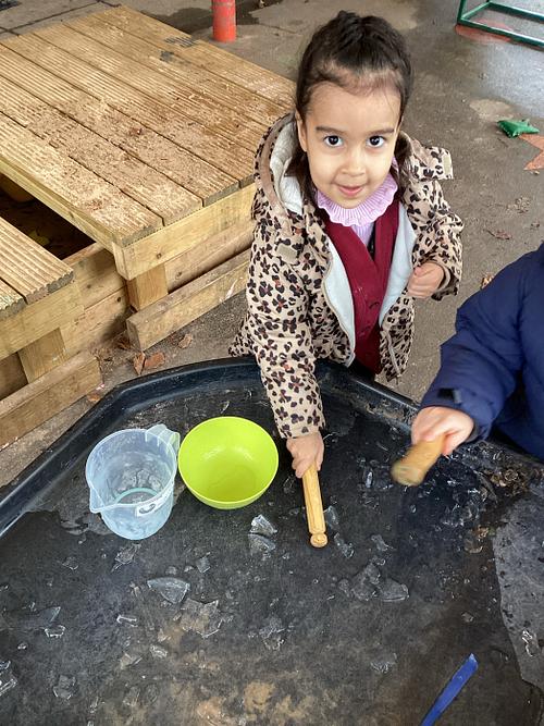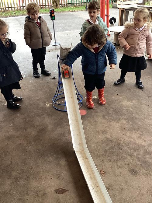 Nursery have also enjoyed a range of investigations, including ice investigations as our water trays and puddles were regularly frozen overnight and exploring ramps with cars. They experimented with different heights and surfaces, learning about cause and effect while making predictions about which ramp would make the cars go the furthest.