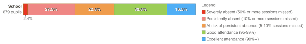 This graph shows the percentage of children who have excellent attendance and the percentage of those who have poor attendance. In some cases, we are aware of genuine reasons for school absence.