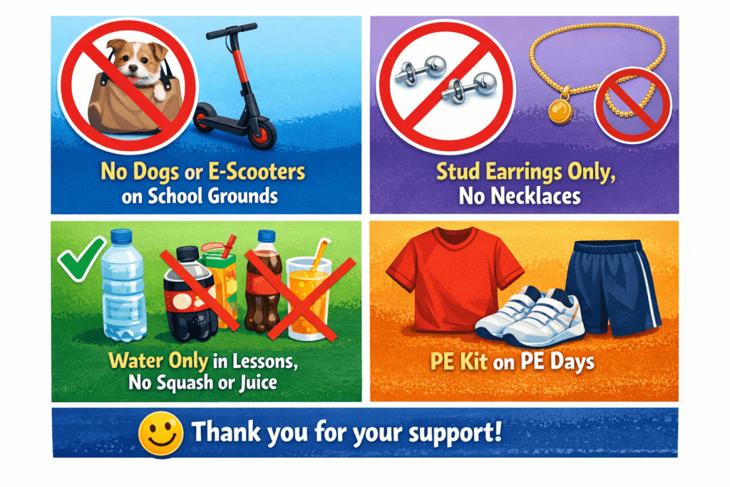 - The council does not permit dogs on school sites, even if they are being carried, and e-scooters are also not allowed on site.