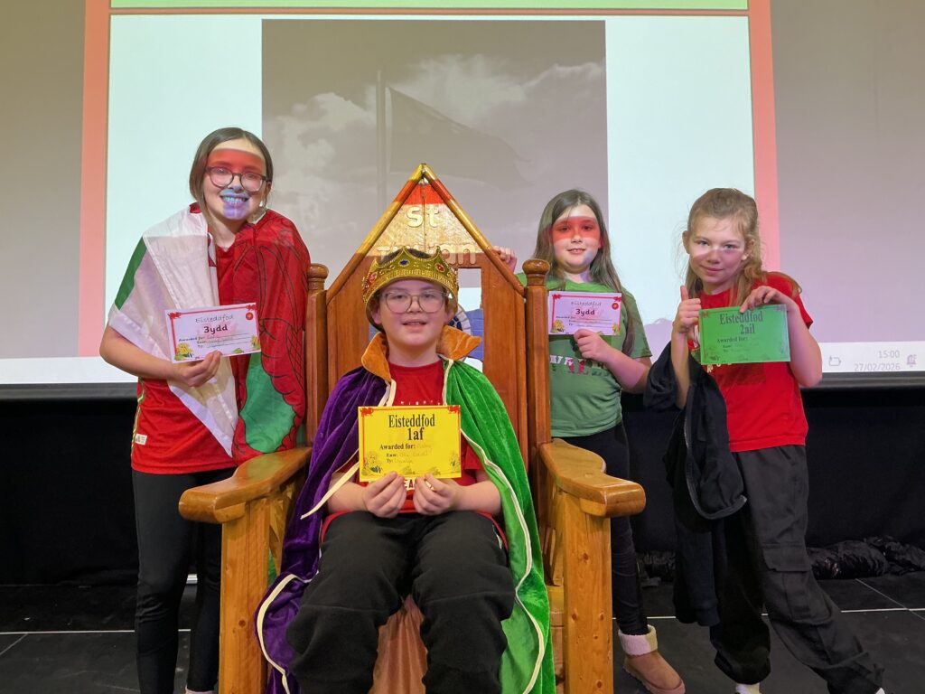 We had a wonderful school Eisteddfod at the beginning of this half-term, which was live streamed for parents to enjoy from home. We hold a School Eisteddfod to celebrate Welsh culture and language, giving children the opportunity to express themselves creatively through music, poetry, art and performance while developing confidence and a sense of belonging. Our four houses competed in a wide range of competitions, including singing, handwriting, poetry recitation, art, musical performances and story and poetry writing. It was fantastic to see so many pupils sharing their talents and celebrating Welsh culture. Our youngest learners in Nursery and the Infants also took part in a joyful ‘Mini Eisteddfod’ after lunch, with their own competitions and plenty of dancing.