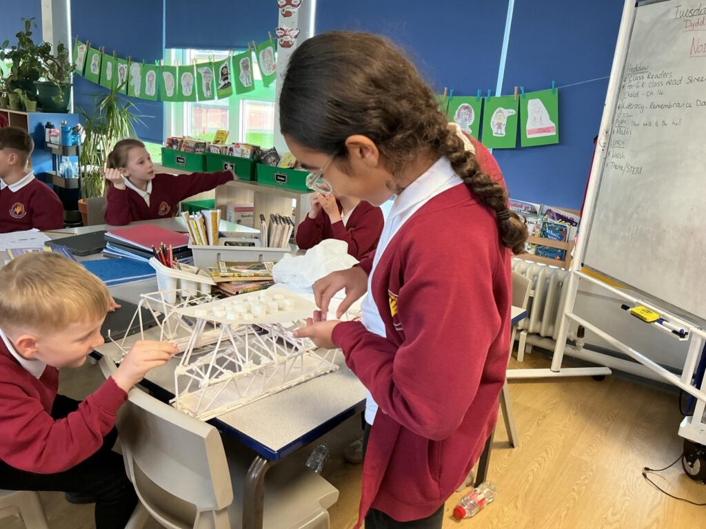 A visit from the Newport Transporter Bridge project team provided us with a real insight into this iconic symbol of the city of Newport. The bridge opened in 1906 and has dominated the Newport skyline ever since. Did you know it is approximately 74 metres tall, which is the height of 18 elephants or 16 double decker buses? This inspired children to have a go at building their own paper straw bridges. This meant investigating which shape was the strongest to use… it turns out triangles rule! We tested the strength of the bridges by adding weights.